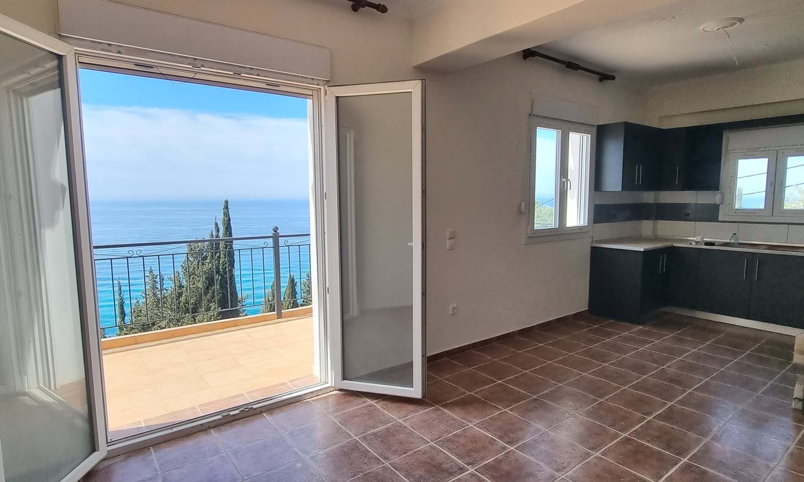This charming property features an open plan living area that seamlessly connects to a modern kitchen, enhanced by French doors leading to a spacious terrace with breathtaking sea views. The main floor includes a well-appointed bedroom with built-in wardrobes and an ensuite bathroom complete with a full bath. A guest room is also located on this level, equipped with a WC and shower for added convenience.