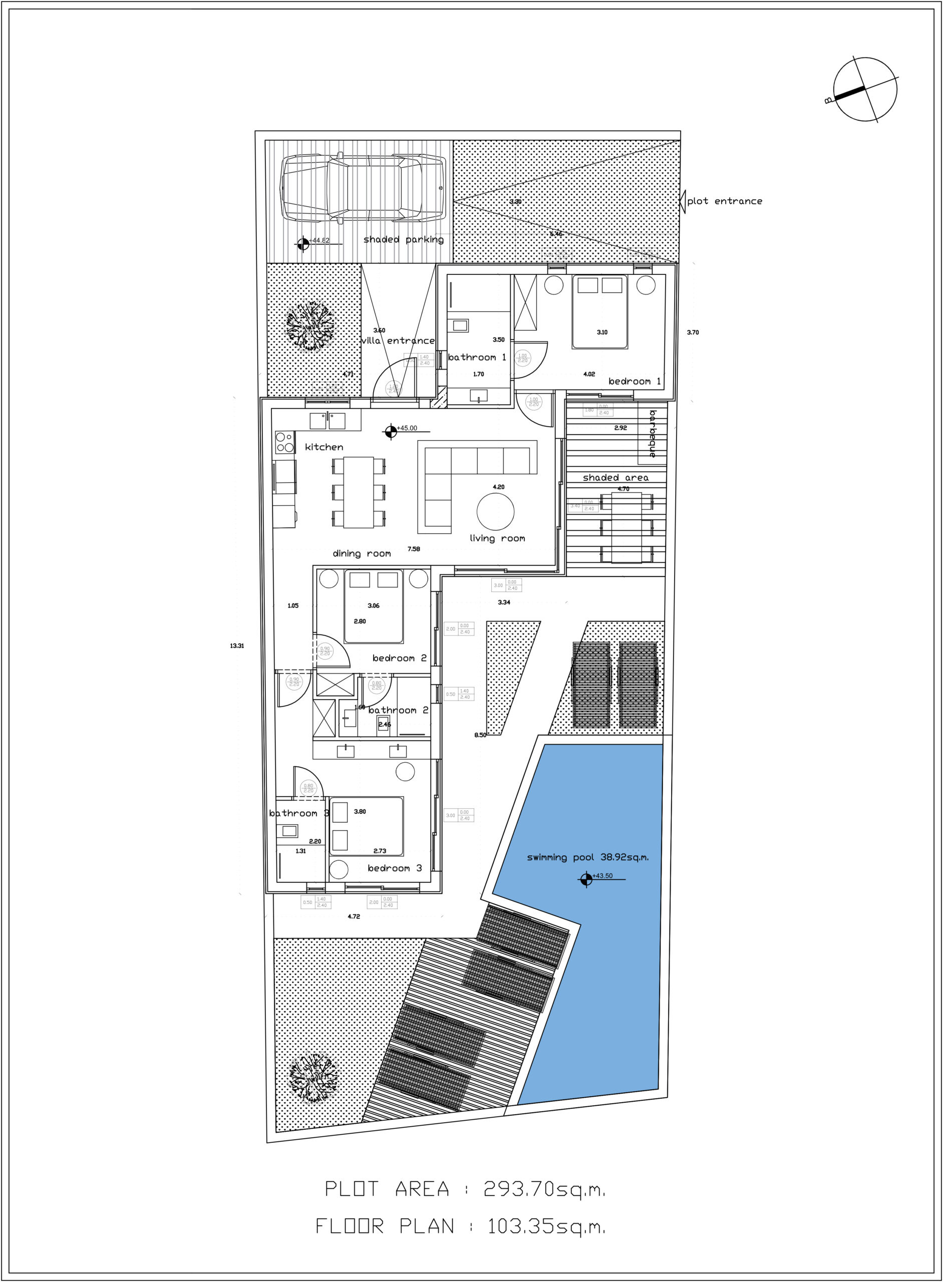 Villa 21 is a beautifully designed property spanning 103.35 square meters, perfectly suited for families or groups of up to six people. This villa features three spacious bedrooms and three well-appointed bathrooms, ensuring comfort and privacy for all occupants. The outdoor area includes a generous swimming pool of 38.92 square meters and an outdoor barbeque kitchen, ideal for entertaining or enjoying sunny days by the water. With a plot size of 293 square meters, there’s ample space for relaxation and leisure.