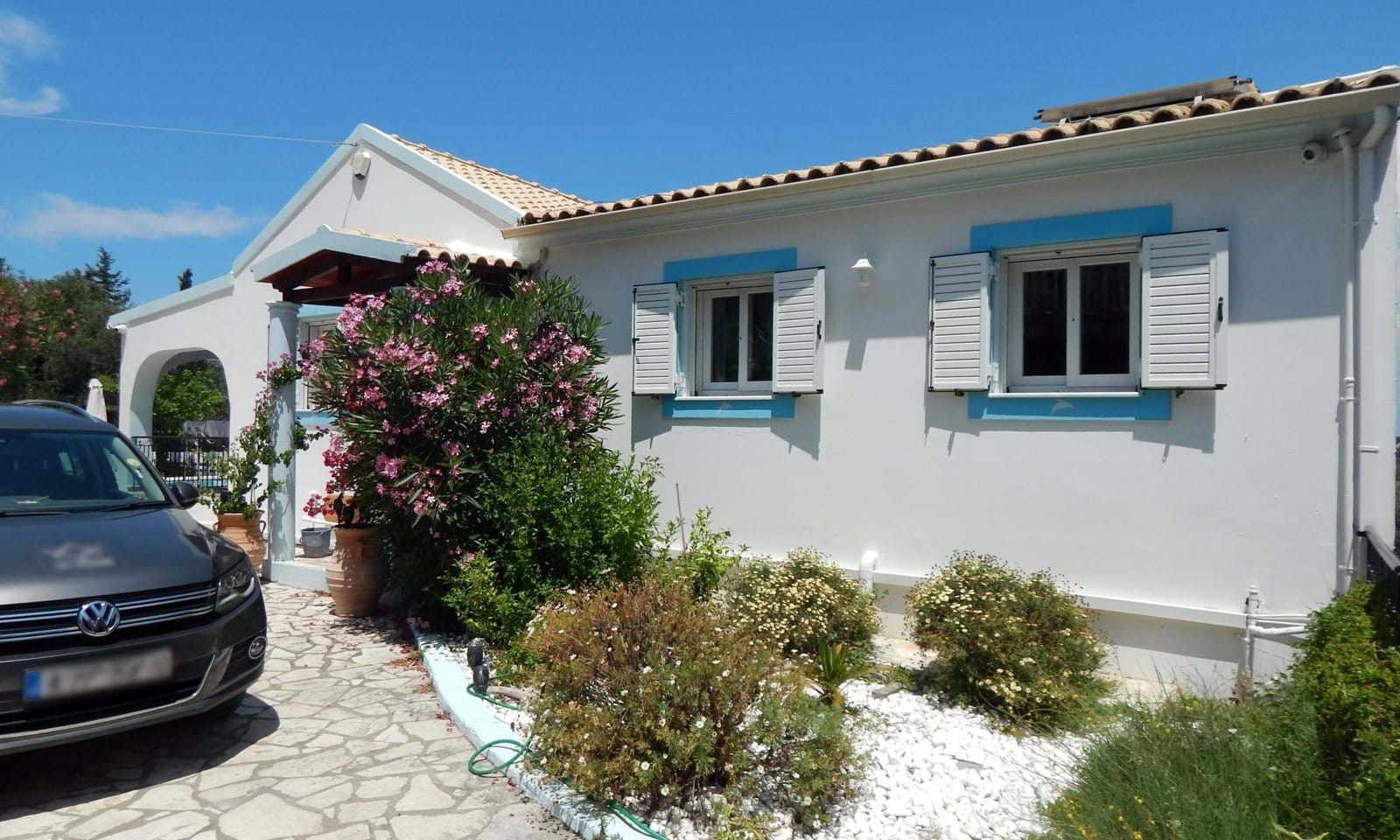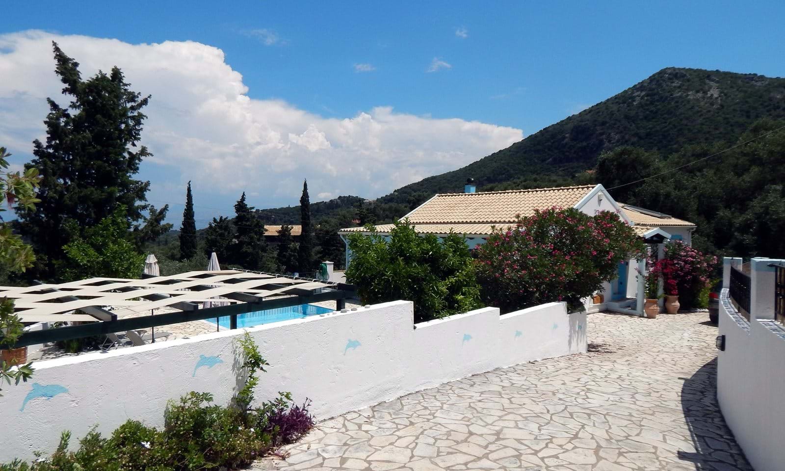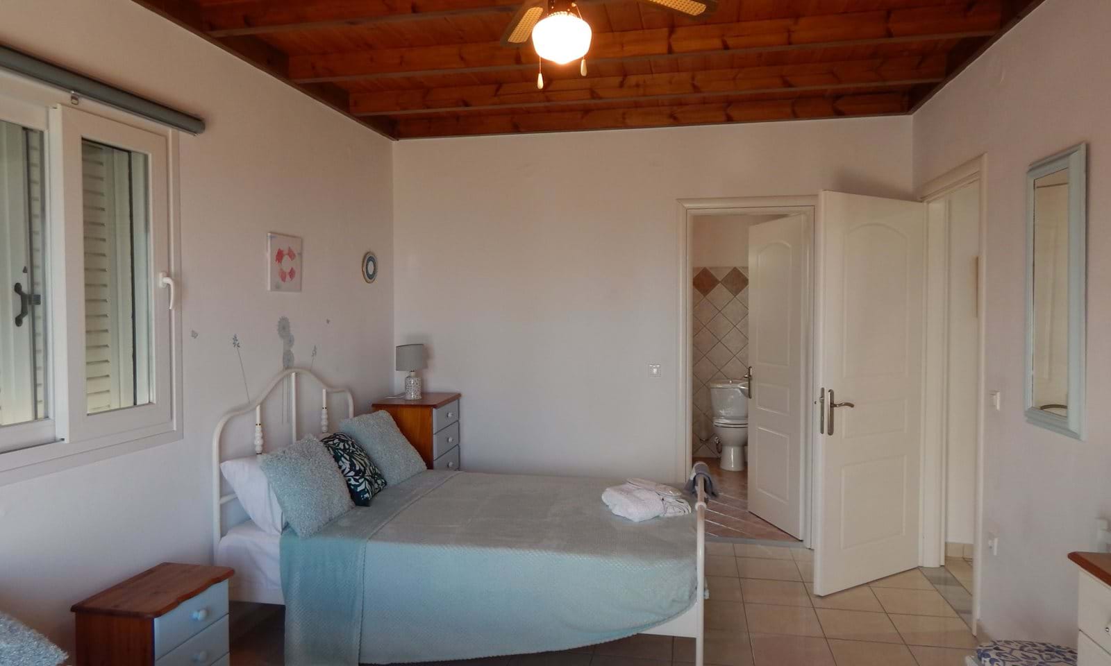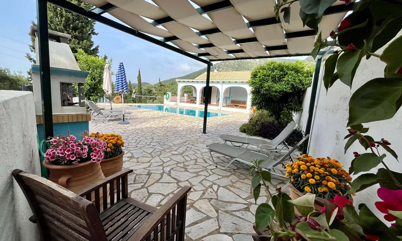 The villa is a charming property nestled in the serene hills above Acharavi, offering a perfect blend of seclusion and accessibility. The entrance features a gated wall with an ‘in/out’ driveway leading to the front door, which opens into a spacious sitting room and kitchen filled with natural light. Patio windows on two sides provide stunning views and access to a covered terrace overlooking the pool, as well as an uncovered balcony that showcases the picturesque garden and sea beyond.