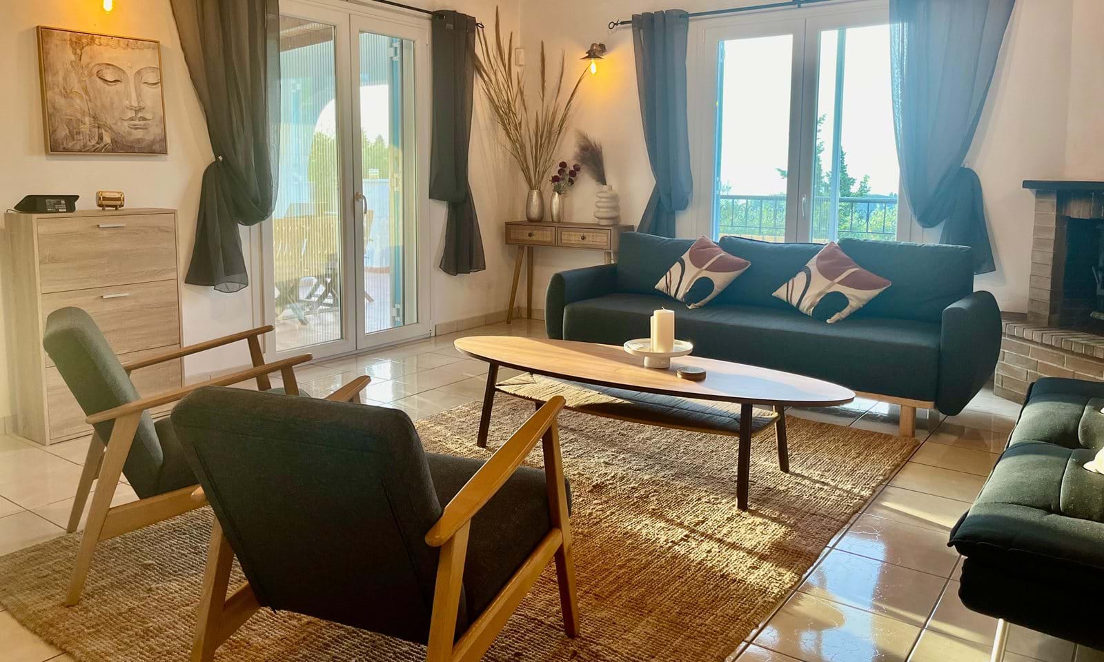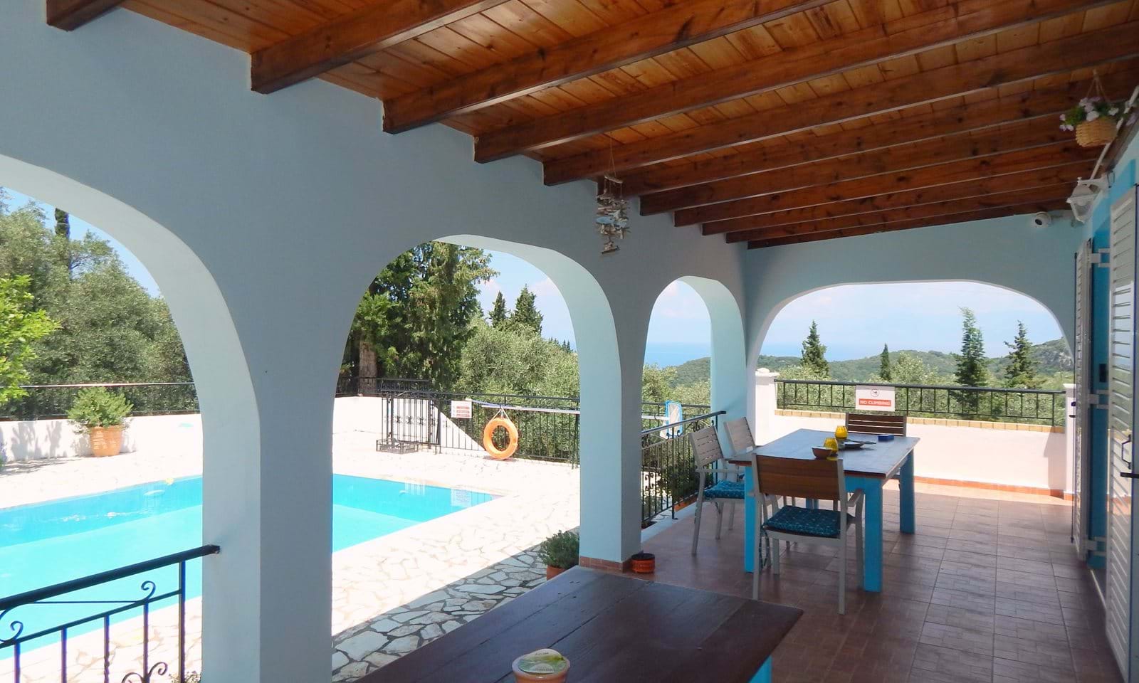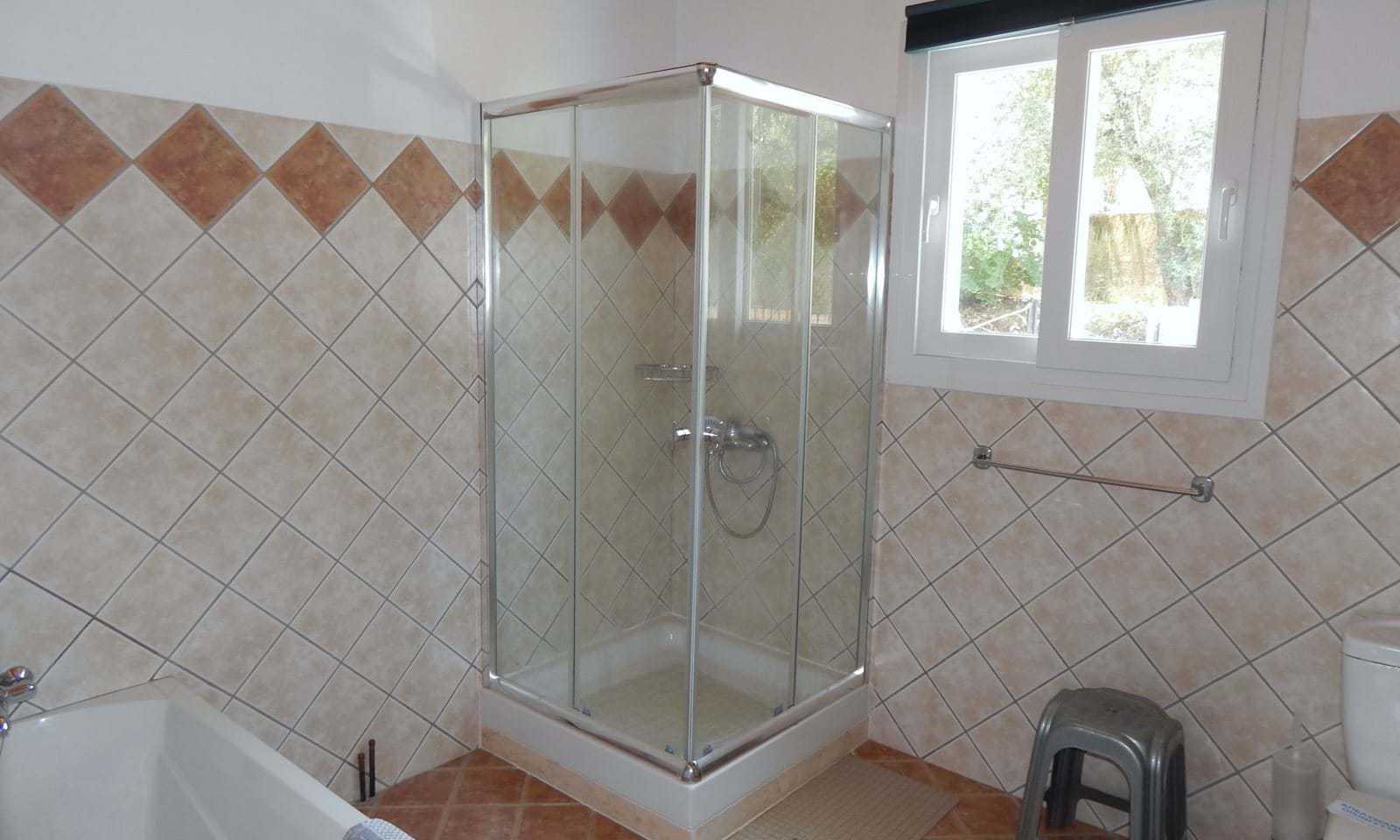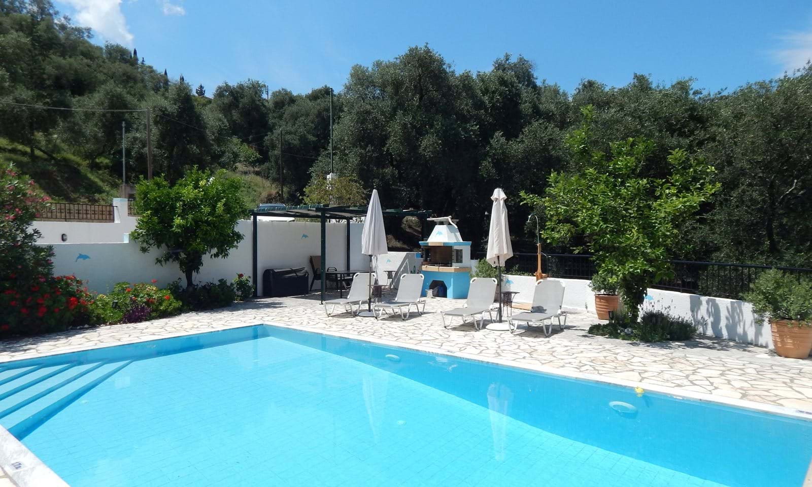 The villa is a charming property nestled in the serene hills above Acharavi, offering a perfect blend of seclusion and accessibility. The entrance features a gated wall with an ‘in/out’ driveway leading to the front door, which opens into a spacious sitting room and kitchen filled with natural light. Patio windows on two sides provide stunning views and access to a covered terrace overlooking the pool, as well as an uncovered balcony that showcases the picturesque garden and sea beyond.