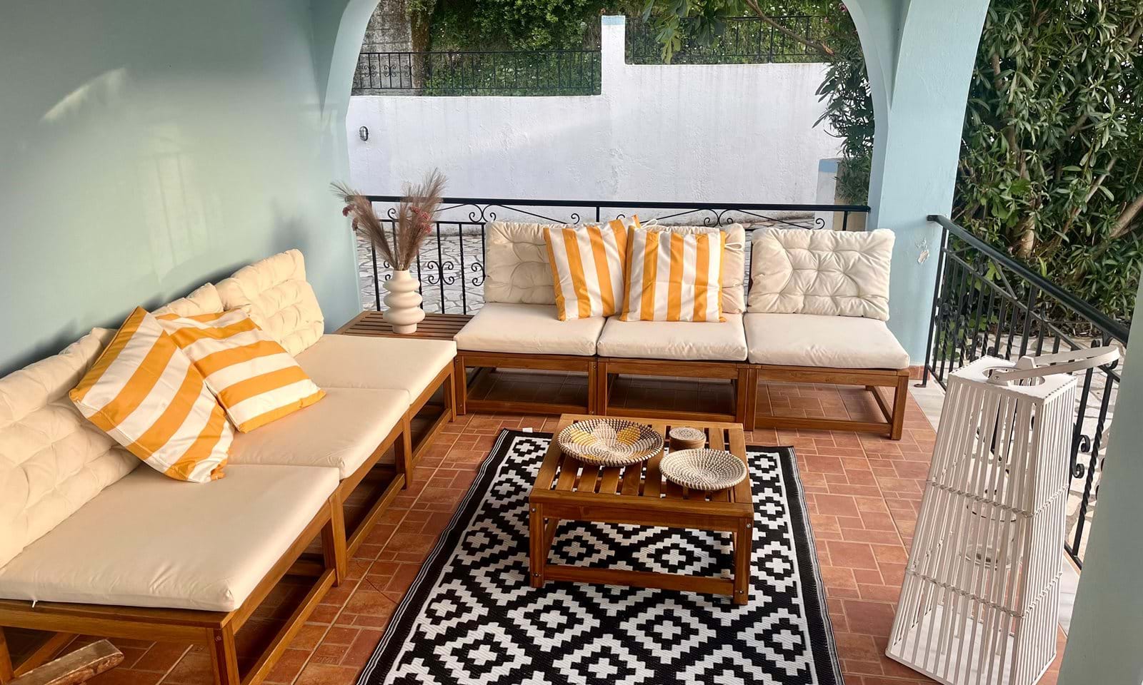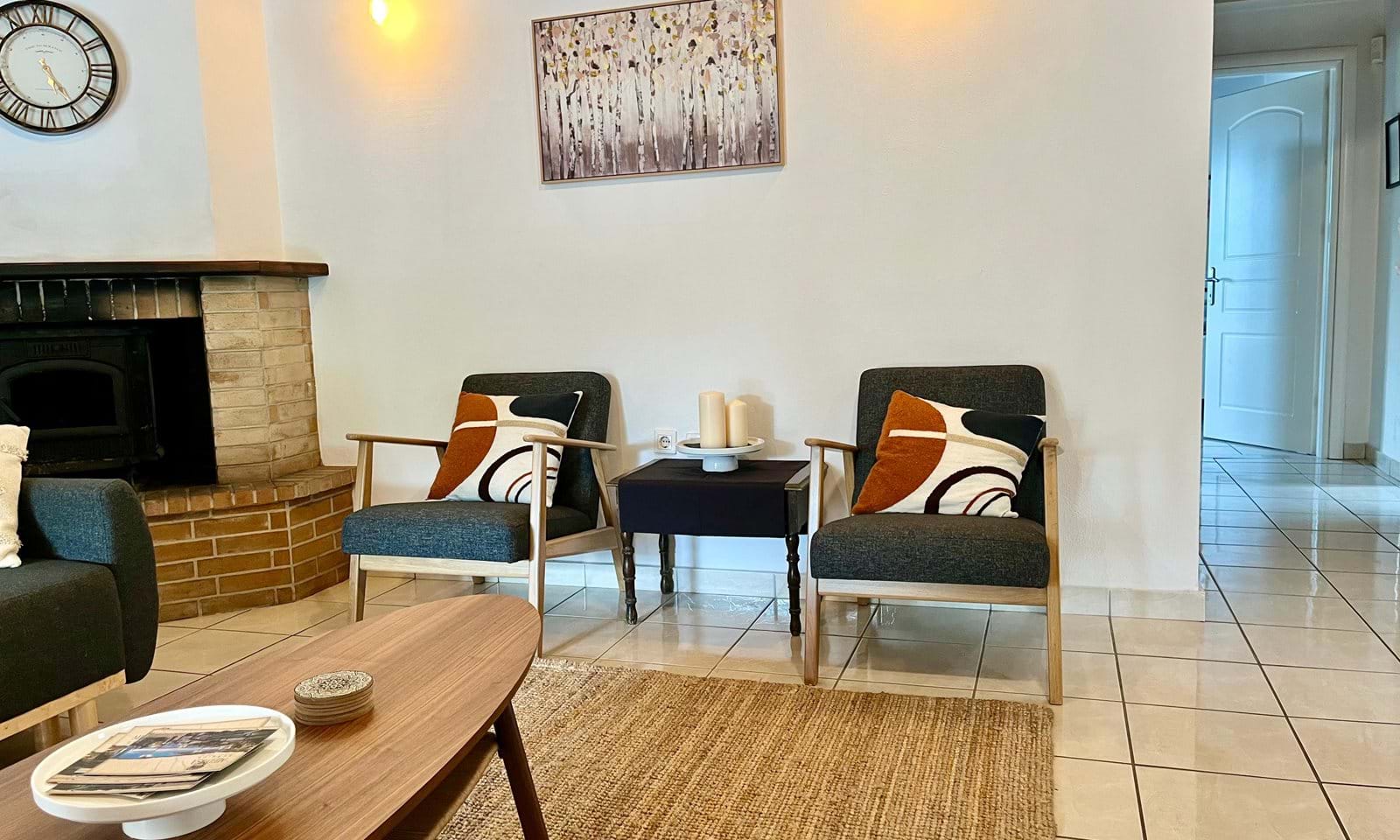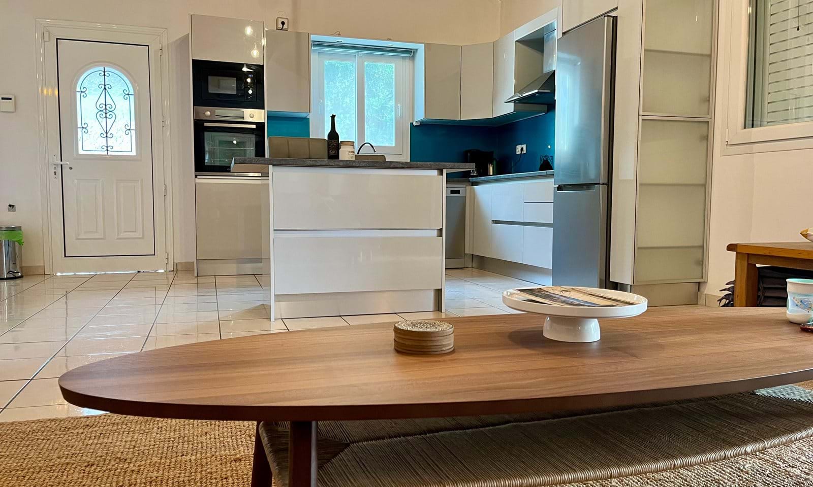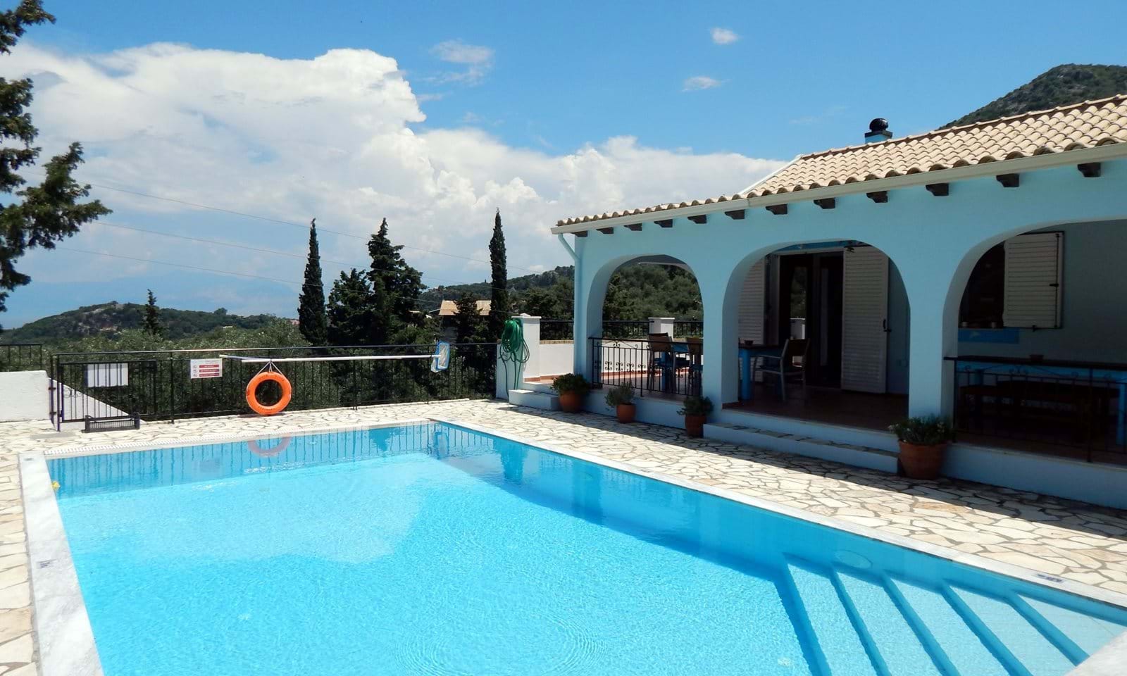 The villa is a charming property nestled in the serene hills above Acharavi, offering a perfect blend of seclusion and accessibility. The entrance features a gated wall with an ‘in/out’ driveway leading to the front door, which opens into a spacious sitting room and kitchen filled with natural light. Patio windows on two sides provide stunning views and access to a covered terrace overlooking the pool, as well as an uncovered balcony that showcases the picturesque garden and sea beyond.