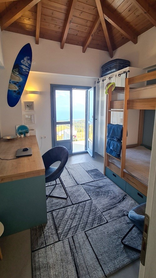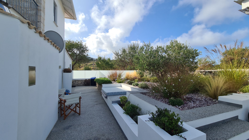 Spread over two levels, the ground floor includes two bedrooms and a bathroom, while the second floor boasts two additional bedrooms with en-suite bathrooms and private balconies overlooking the pool area. Just 1.65 km from the sea, this well-appointed home combines modern amenities with serene surroundings for an ideal Greek lifestyle.
